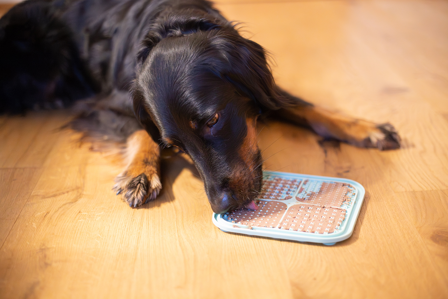Bild von einem Hund, der an einer Schleckmatte leckt, die mit Leberwurst bestrichen ist