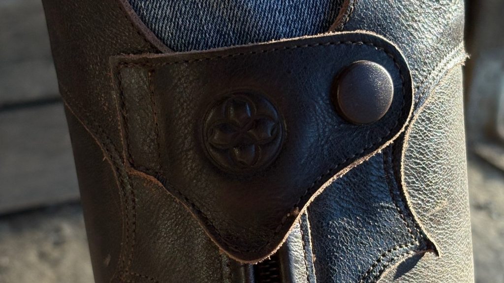 Ein echtes Highlight – und für mich ein spürbares Upgrade – ist die Lederinnenlasche hinter dem Reißverschluss. Dieses Detail kenne ich vor allem von Englischreitstiefeln. Es nun auch bei diesem Winter-Westernstiefel zu sehen, freut mich sehr. Sie verhindert, dass ich beim Anziehen mit der Ferse am Reißverschluss hängen bleibe, schützt diesen zuverlässig und macht den Einstieg insgesamt deutlich angenehmer. Solche kleinen, aber cleveren Details zeigen, wie viel Wert bei diesem Stiefel auf Komfort und Langlebigkeit gelegt wurde.